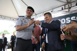 O governador Mauro Mendes oficializou a entrega de novos armamentos, viaturas, motocicletas e equipamentos para a Polícia Militar de Mato Grosso, em solenidade realizada na tarde desta terça-feira (03.01), na Praça das Bandeiras, em .