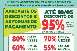 A Prefeitura renovou as condições do Refis 2023 e até o dia 18, o contribuinte que possuía dívidas junto ao Município, pode obter desconto máximo de até 95% sobre juros e multas. Parcelamento também é opção e pode ser feito em .
