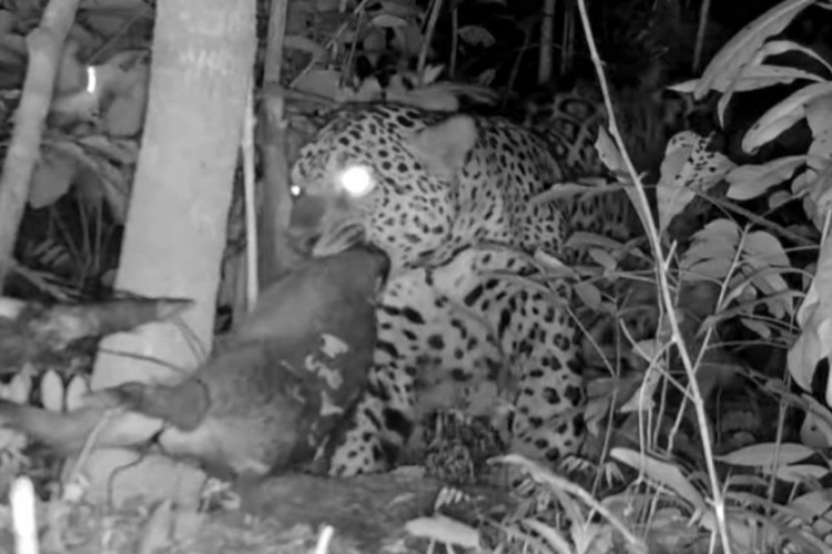 Armadilha fotográfica registra onça devorando porco em fazenda em Sinop