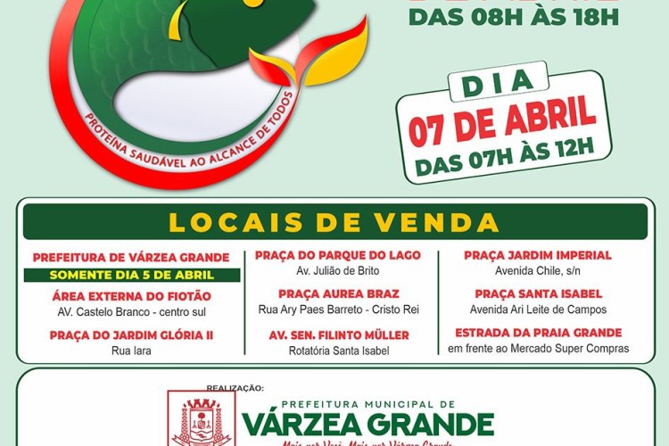 Visando atender a demanda da população por um peixe de qualidade e preços mais em conta para o feriado de Sexta-feira Santa, que ocorre no próximo dia 07 de abril, e, simboliza o jejum cristão e a preparação para o renascimento de Jesus na Páscoa, a Prefeitura de Várzea Grande em parceria com a Associação dos Aquicultores de Mato Grosso (AQUAMAT) promove nos dias 05, 06 e 07 de abril, a 2ª edição do projeto “VG Peixe Santo”.